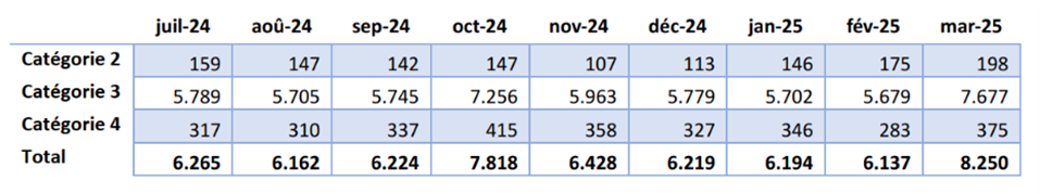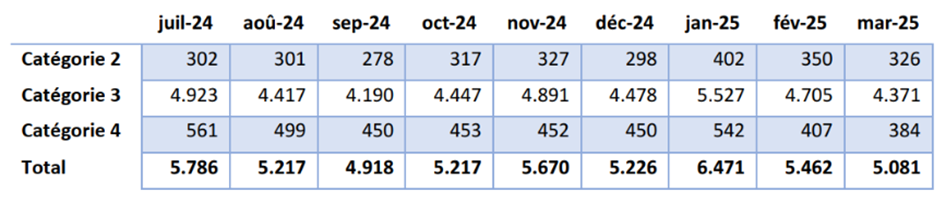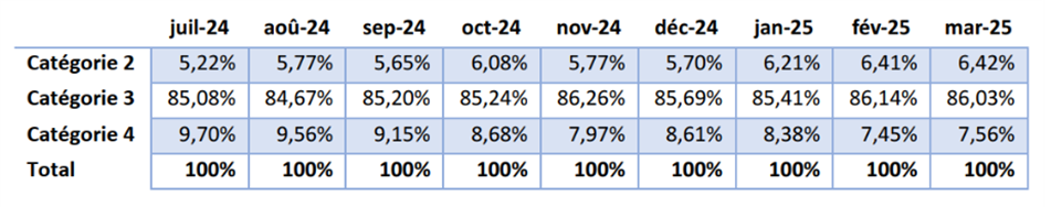 Le tableau 15 présente la répartition en pourcentage des personnes au sein des trois catégories. Ces pourcentages montrent, à l'exception des mois de février et mars 2025, une évolution légèrement positive du nombre de personnes dans la catégorie 4.