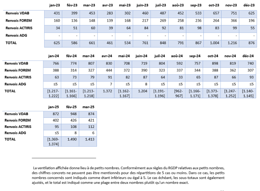 Les chiffres pour les renvois sont affichés pour le régime des travailleurs salariés et le régime des travailleurs indépendants afin de permettre une comparaison avec le nombre de présentations auprès du service régional de l'emploi où cette ventilation n’est pas possible. Ceci permet une comparaison correcte des chiffres entre eux.