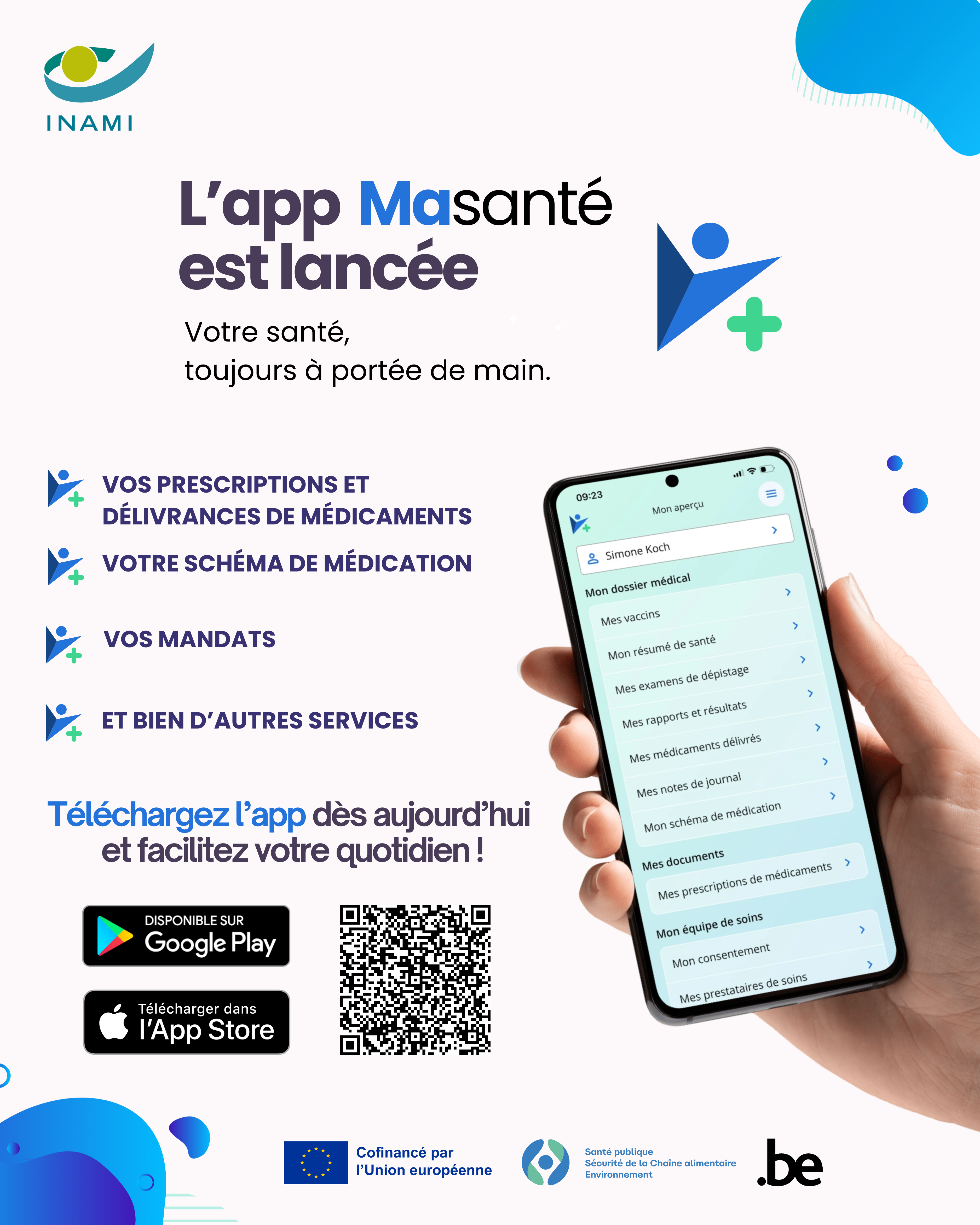 Via « Masanté », vous pouvez aussi accéder à différents services reprenant vos données de santé telles que votre schéma de médication, vos prescriptions ouvertes de médicaments, vos délivrances pharmaceutiques, vos vaccinations, votre résumé de santé et bien d’autres services.