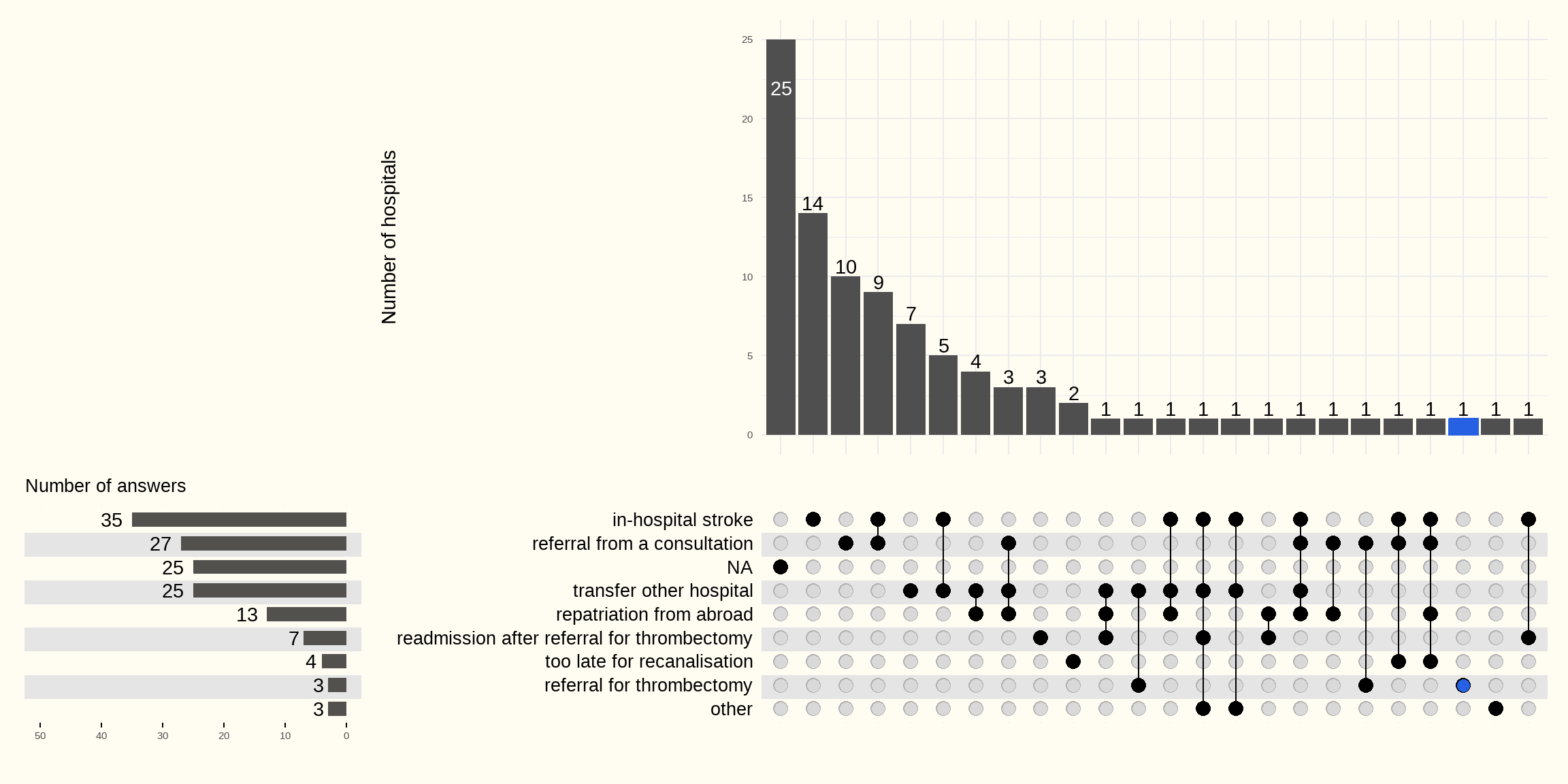 Les raisons les plus courantes pour lesquelles un patient victime d’un AVC est admis sans passer par les urgences sont : un AVC survenu à l’hôpital (le patient était hospitalisé pour une autre raison) et la découverte d’un AVC lors d’une consultation. Un transfert depuis un autre hôpital, éventuellement d’un pays étranger, ainsi qu’une réadmission après orientation pour une thrombectomie expliquent également pourquoi le patient n’a pas été admis via les urgences, en plus d’autres raisons moins fréquentes.