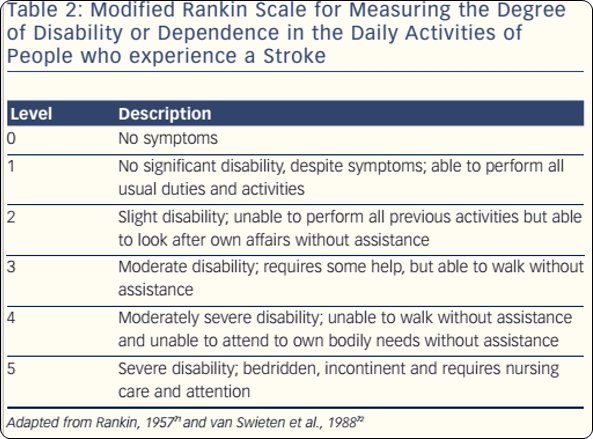 La Modified Rankin Score (mRS) est une échelle d’invalidité à 6 items avec des scores possibles de 0 à 5. Pour les patients décédés, une catégorie distincte de 6 est généralement ajoutée. La Modified Rankin Score (mRS) est la mesure de résultat la plus utilisée dans les études cliniques sur l’AVC