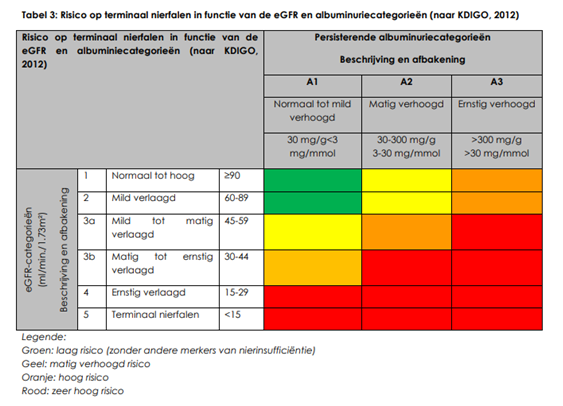 Une autre classification est établie en fonction de la cause de la maladie rénale, des six stades du DFG estimé (DFGe) et des trois catégories d’albuminurie. La catégorie d’albuminurie est déterminée par le rapport albumine-créatinine (RAC) et l’albuminurie sur 24 heures (mg/24 heures). Ces facteurs permettent d’évaluer le risque d’insuffisance rénale terminale (De Boer et al. 2020).