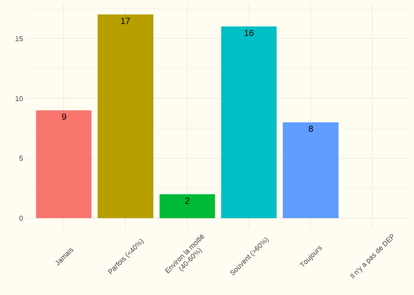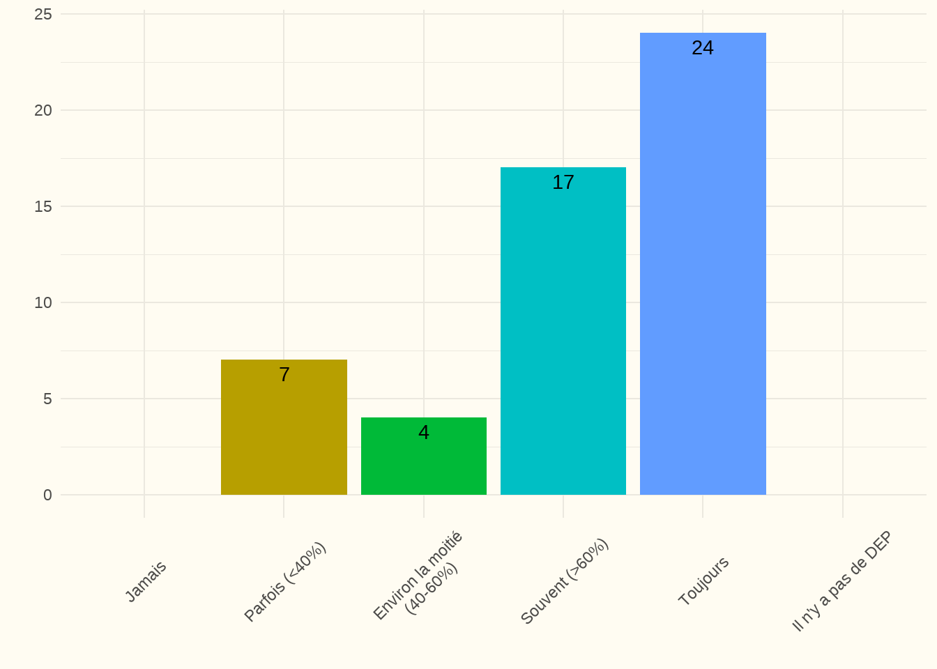 Constatation : La moitié des centres ont indiqué qu’une Advanced Care Planning (ACP) ) est « parfois » ou « jamais » réalisée et enregistrée dans le DEP des patients âgés de plus de 70 ans. Le taux de réponse a été de 100 %.