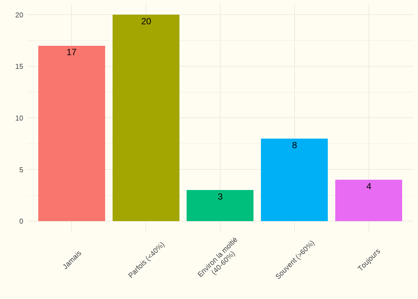 Constatation : Dans 71 % des centres, ces échelles ont été utilisées « parfois » ou « jamais ». Seuls 8 % des centres les utilisent de façon systématique. 67 % des répondants ont répondu à la question relative aux échelles utilisées. Parmi celles-ci, le Mini-Mental State Examination (62 %), l’échelle de Katz (60 %) et la Clinical Frailty Scale (Score de fragilité clinique) (46 %) ont été citées, et 37 % des répondants ont (également) mentionné d’autres échelles.