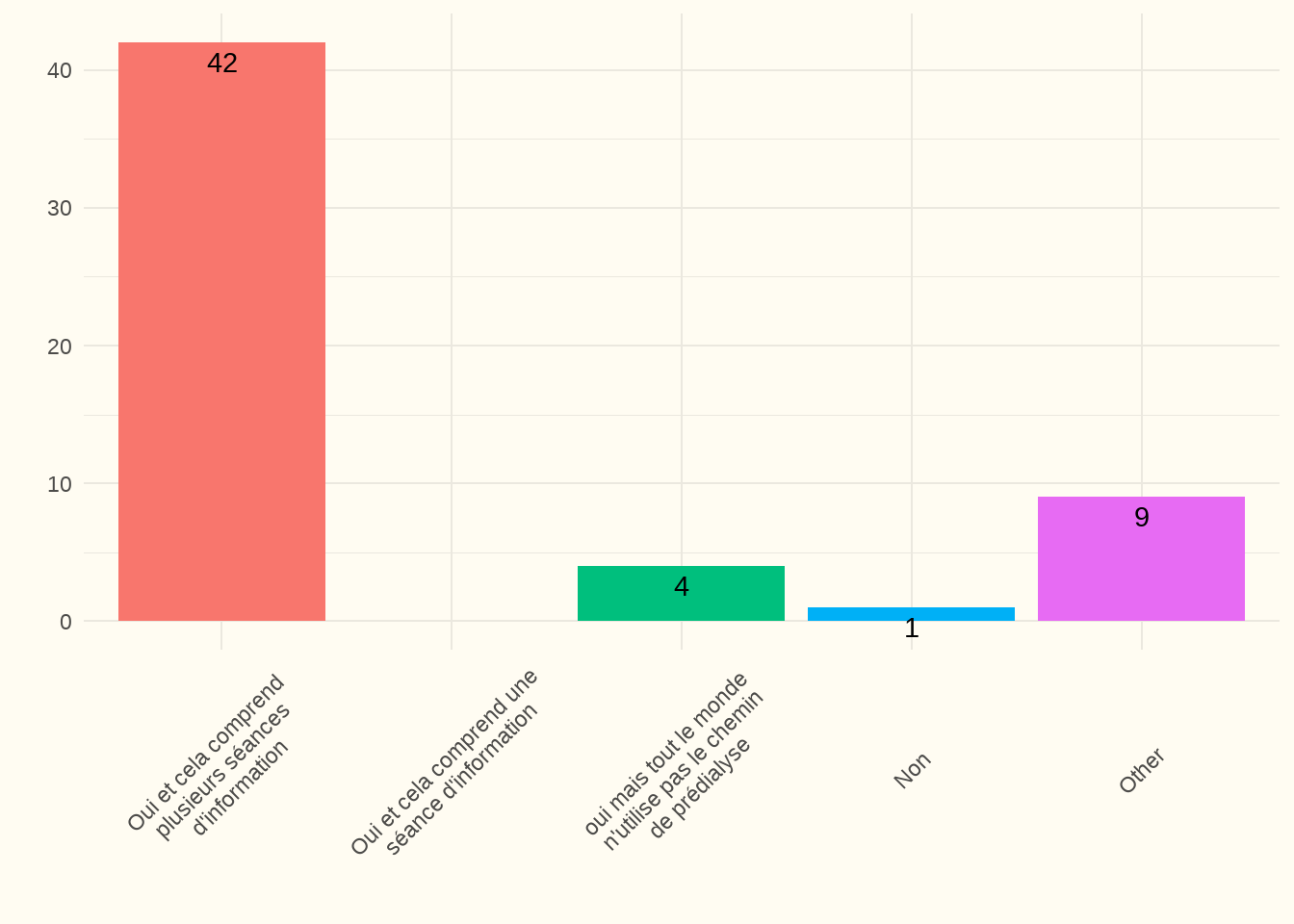 Constatation : Dans 8 centres sur 10, la politique en matière de soins était largement conforme aux données scientifiques en la matière. Outre le déploiement généralisé d’un trajet de prédialyse multidisciplinaire, une attention supplémentaire doit être accordée à une formation validée de tout le personnel infirmier et des autres prestataires de soins (en tout cas, au niveau de ceux qui fournissent les explications). Une attention particulière doit être accordée à l’éducation la plus personnalisée possible et surtout à l’accompagnement. “All staff, irrespective of their role, need to be trained about all treatment options so that informal conversations with patients are not biased. The study argues for a more individualised approach to Patient Dialysis Education (PDE) which is more like counselling than education and would demand a higher level of skill and training for specialist PDE staff.” (Combes, Sein, et Allen 2017). Un élément important ici, est aussi l’effet sur l’observance thérapeutique : “Patient education improves health and treatment adherence of patients with chronic kidney disease. However, evidence about the sufficiency of patients’ knowledge processed in patient education is limited. Hence, attention should be paid to supporting patients with more personalized knowledge” (Inkeroinen et al. 2021).