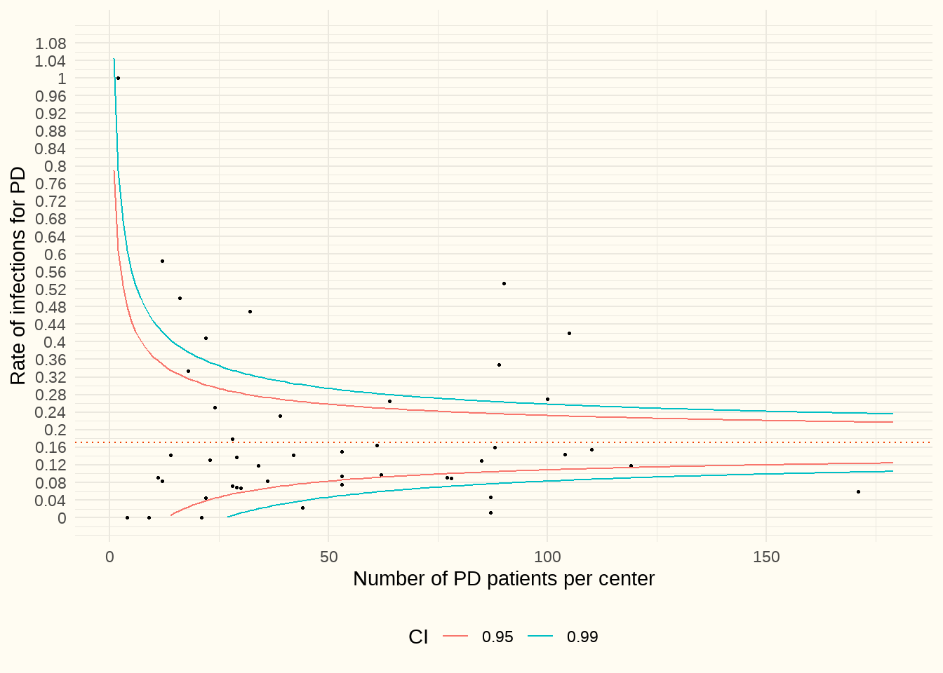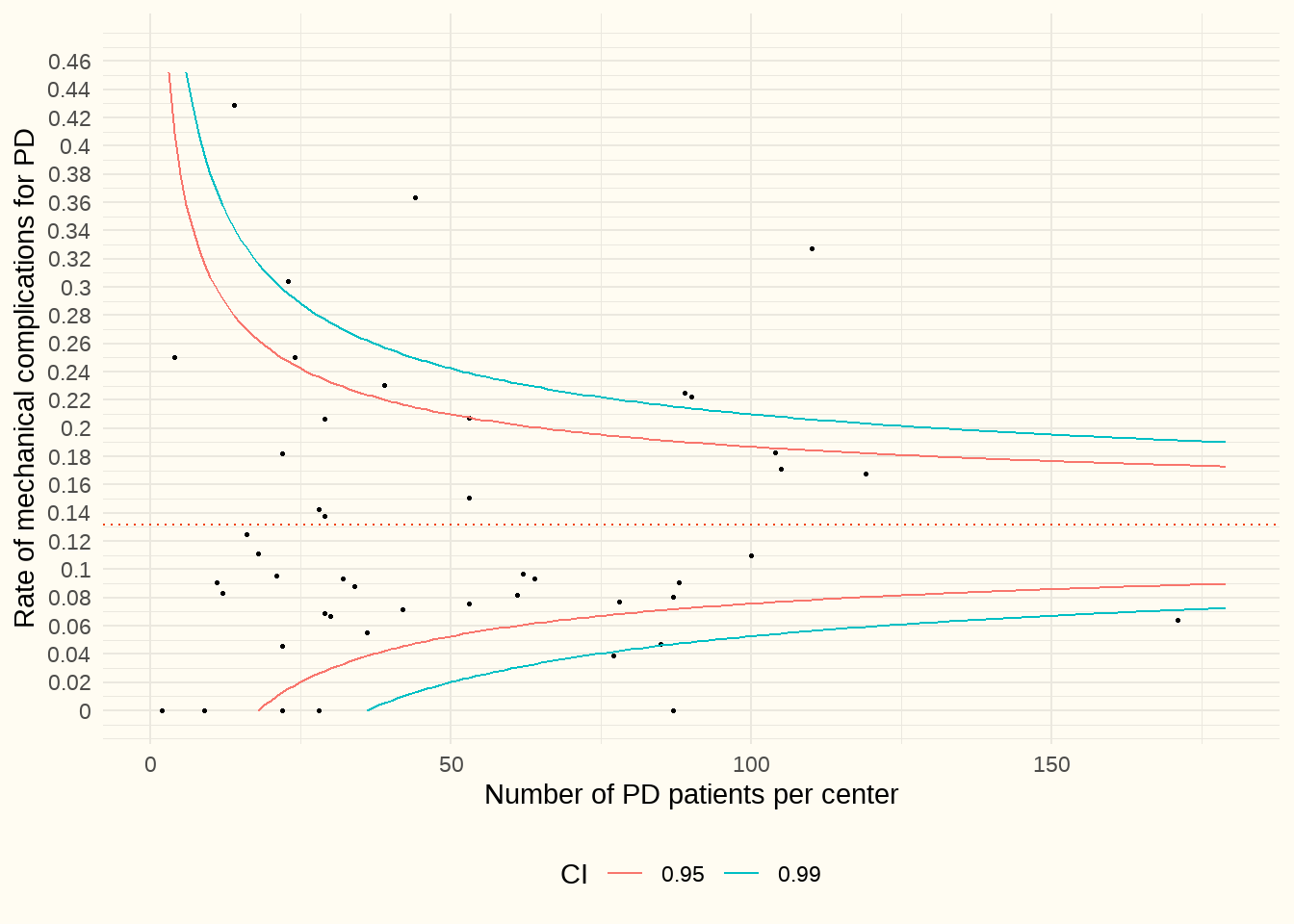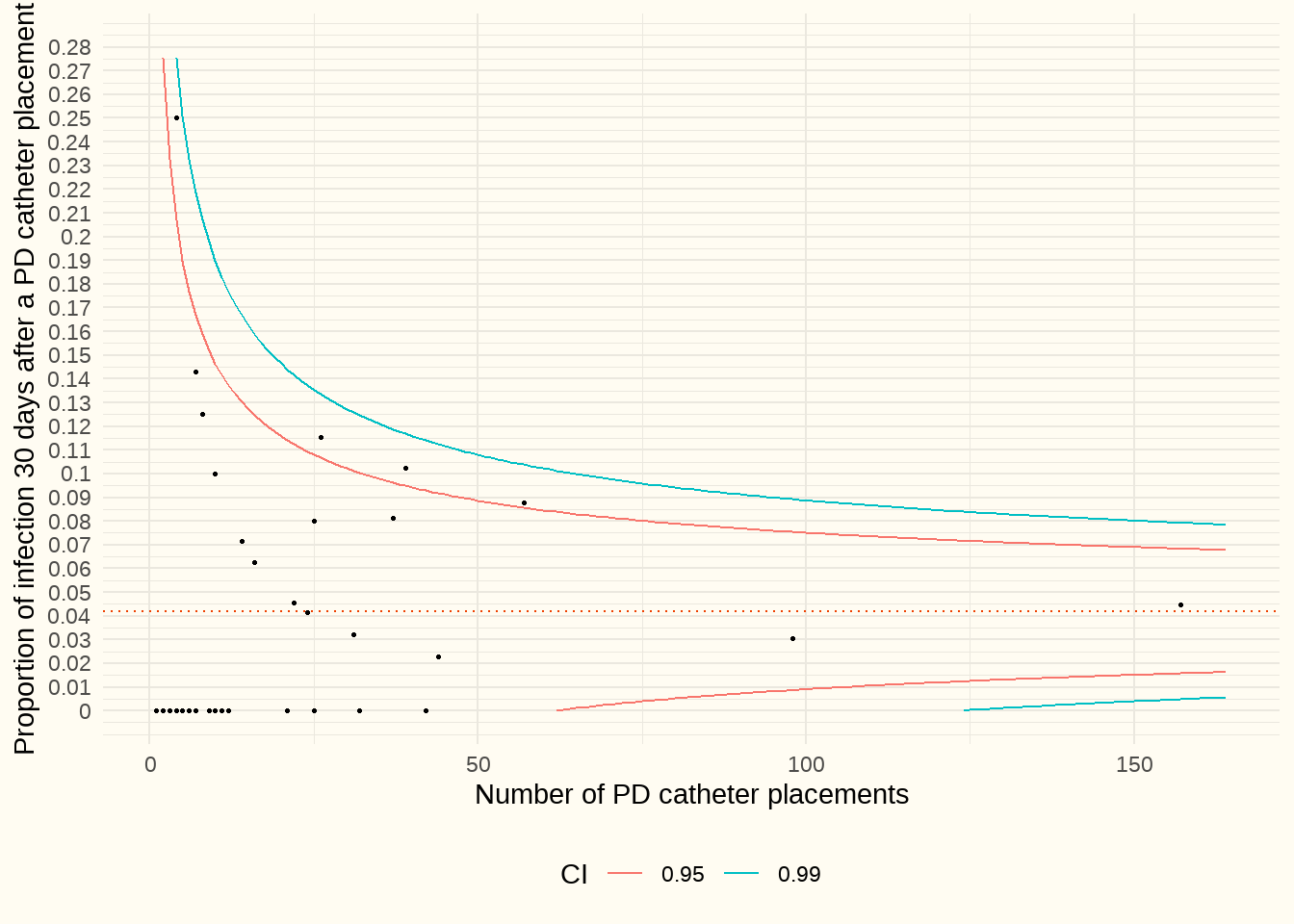 La Figure 7.3 présente un graphique en entonnoir. Ce graphique représente la proportion des hospitalisations (de jour et classiques) pour des infections liées à la voie d’accès (code ICD T85.71, septicémie ou péritonite) dans les 30 jours suivant le placement d’un cathéter de DP, par rapport au nombre de cathéters de DP placés (axe Y). L’axe X indique la taille du centre (sur la base du nombre de cathéters de DP placés).