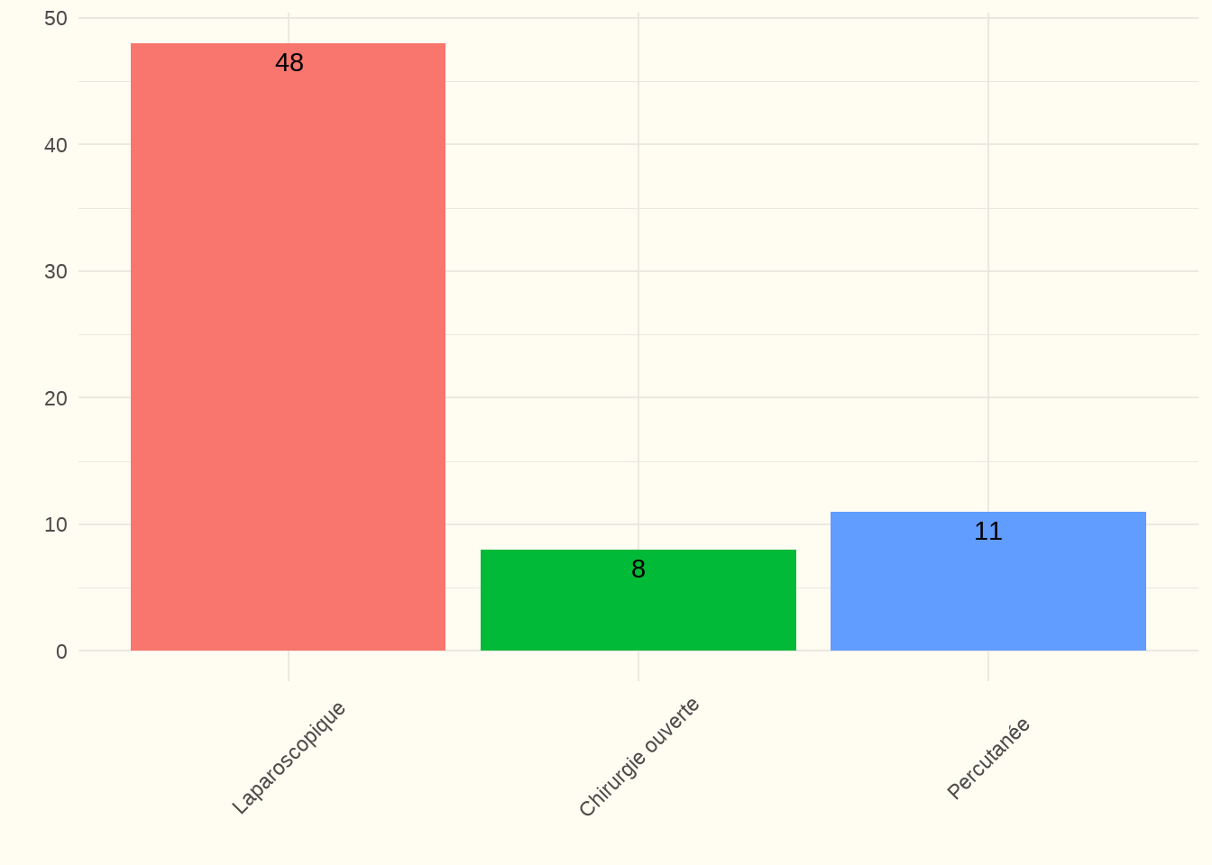 Constatation : Seul un très petit nombre de cathéters de DP ont été placés par ponction (sous anesthésie locale). La grande majorité d’entre eux ont été placés par laparoscopie ou par chirurgie ouverte. C’est aussi ce qui ressort des réponses données sur les questions concernant la/les techniques(s) utilisée(s) dans notre enquête en ligne :