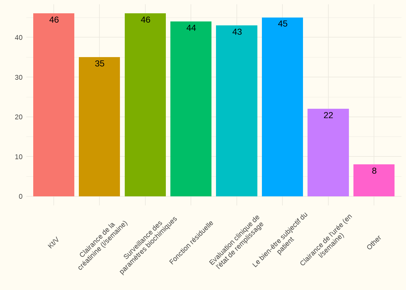 Constatation : « Kt/V » et « suivi des paramètres biochimiques » ont obtenu les meilleurs résultats à cette question (92 %). Notons également que 88 % des répondants déterminent la fonction résiduelle. Enfin, 90 % des répondants ont mentionné aussi suivre le paramètre « bien-être des patients ». Deux centres n’ont pas répondu à cette question. La grande majorité des centres (84 %) ont indiqué qu’ils effectuaient ce suivi de manière systématique une fois ou plusieurs fois par an. Un seul centre n’a pas répondu à cette question.