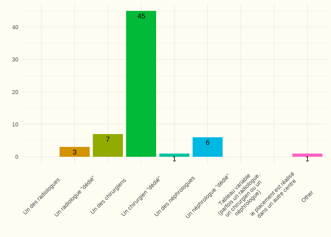 Constatation : 90 % des répondants ont répondu que le placement est effectué par un chirurgien spécifique. Dans 7 centres, il est réalisé (également) par un néphrologue (spécifique ou non spécifique) et dans 3 centres par un radiologue spécifique. Deux centres n’ont pas répondu à cette question. Certains centres confient cette tâche à un chirurgien expérimenté d’un autre hôpital.