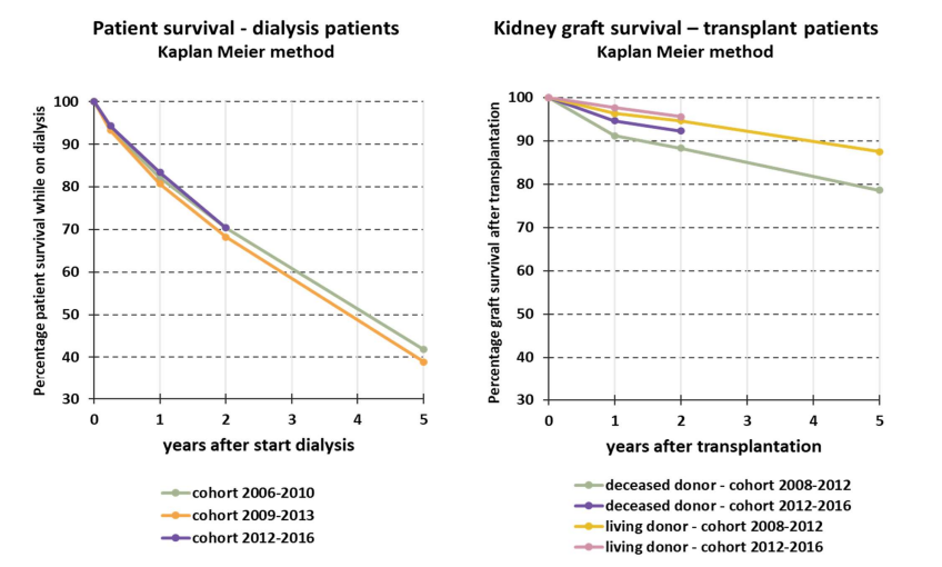 Au niveau européen on peut dire que : “Excess end-stage kidney disease–related mortality rates have decreased substantially over time among adults recorded in the European Renal Association–European Dialysis and Transplant Association (ERA-EDTA) Registry, with the largest relative decreases in the youngest adults and the largest absolute decreases in the oldest adults… Possible contributors to the observed improvements include technical advances in dialysis, changes in dialysis access practices, new medications, uptake of clinical practice guidelines, increased access to transplantation for the elderly, improved allograft survival, and change in selection of patients for RRT, among others. However, despite evident improvements, this study also emphasizes the continued high excess mortality rates, particularly among those treated with dialysis. It also highlights important differences in excess mortality risks in different countries and possible increases in the excess risk of mortality in elderly transplant recipients over time, driven by increases in atheromatous cardiovascular disease–-related and malignancy-related mortality.” (Foster 2020).