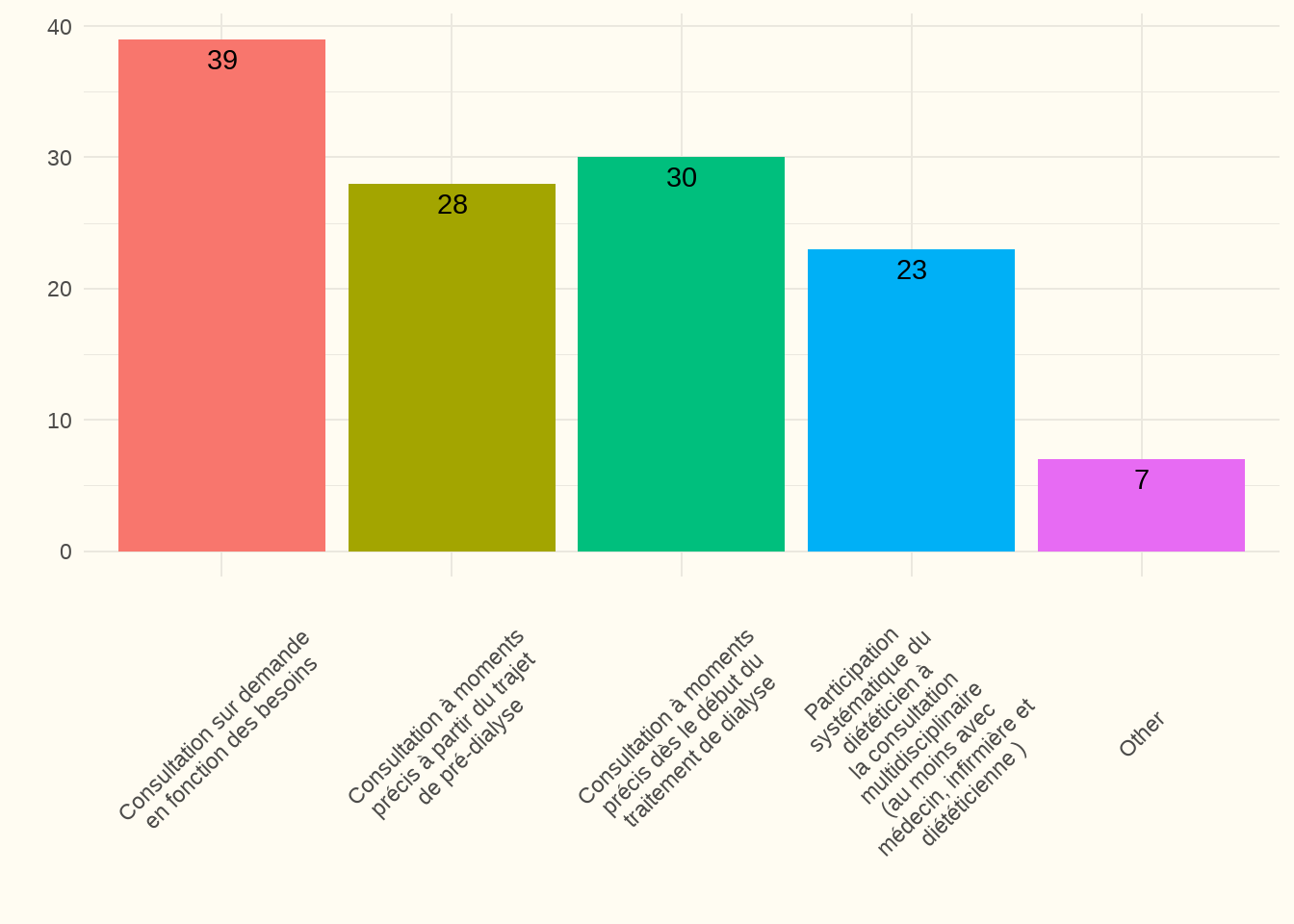L’étude s’est également penchée sur la question de savoir quand le diététicien était impliqué. Dans la majorité des centres (21/24), il l’était dès les premiers jours suivant le début de la dialyse, souvent avec un suivi mensuel. Dans la moitié des centres (12/24), le diététicien était déjà impliqué dès le début du trajet de prédialyse. Dans quelques centres, il n’y avait pas d’implication structurelle d’un diététicien et il était plutôt consulté de manière exceptionnelle (notamment dans le cadre de discussions financières sur la question de savoir qui devait rembourser le diététicien).