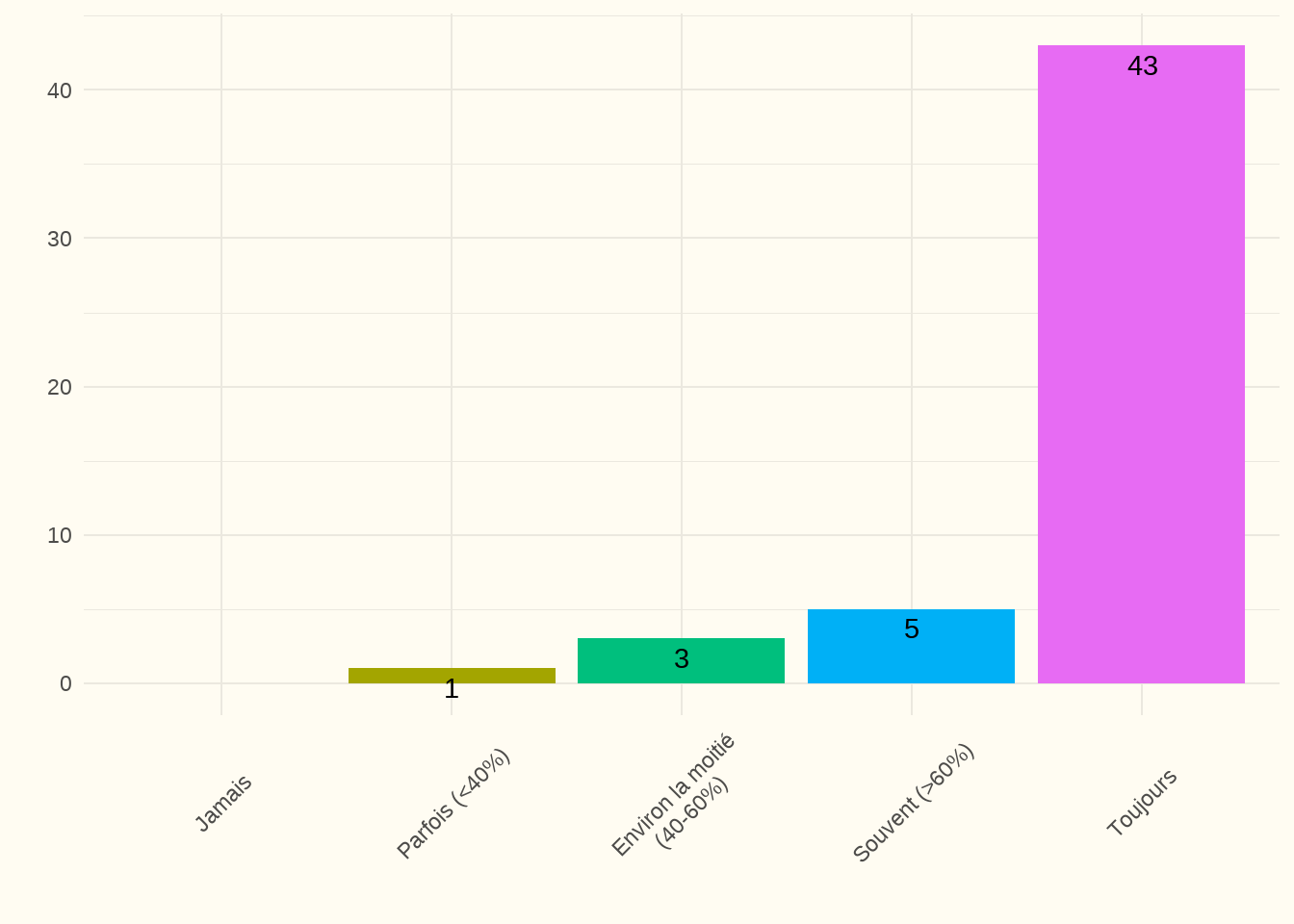 Constatation : Dans la majorité des centres (83 %), les patients dialysés bénéficient d’un accompagnement par un ou plusieurs diététicien(s) « attitré(s) ». Dans 1 centre seulement, cet accompagnement diététique n’est qu’exceptionnel Le taux de réponse a été de 100 %.