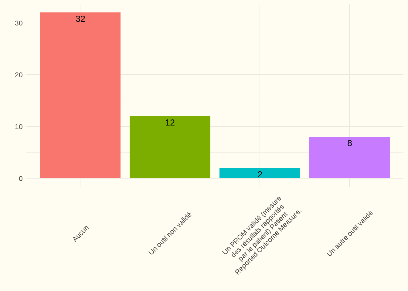 Constatation: 61 % des centres ont déclaré ne pas utiliser d’outils. Seuls 2 centres ont déclaré utiliser un PROM validé.