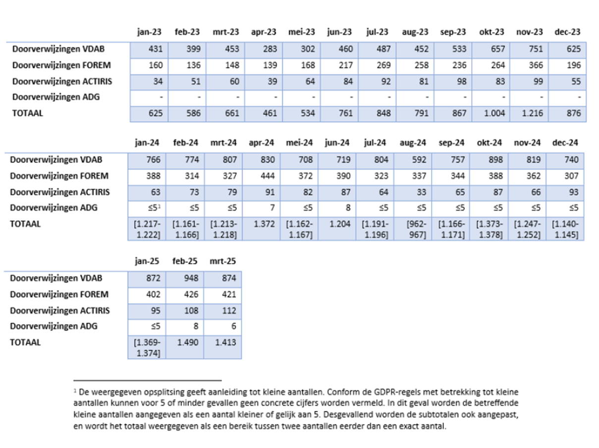 Daarnaast geeft deze tabel ook een overzicht van het aantal aanmeldingen binnen routing C bij Actiris, opgesplitst per maand. Dit pilootproject is opgestart in mei 2023. De aanmeldingen worden geteld in de maand waarin deze hebben plaatsgevonden. De hier weergegeven cijfers betreffen zowel de loontrekkenden als de zelfstandigen.