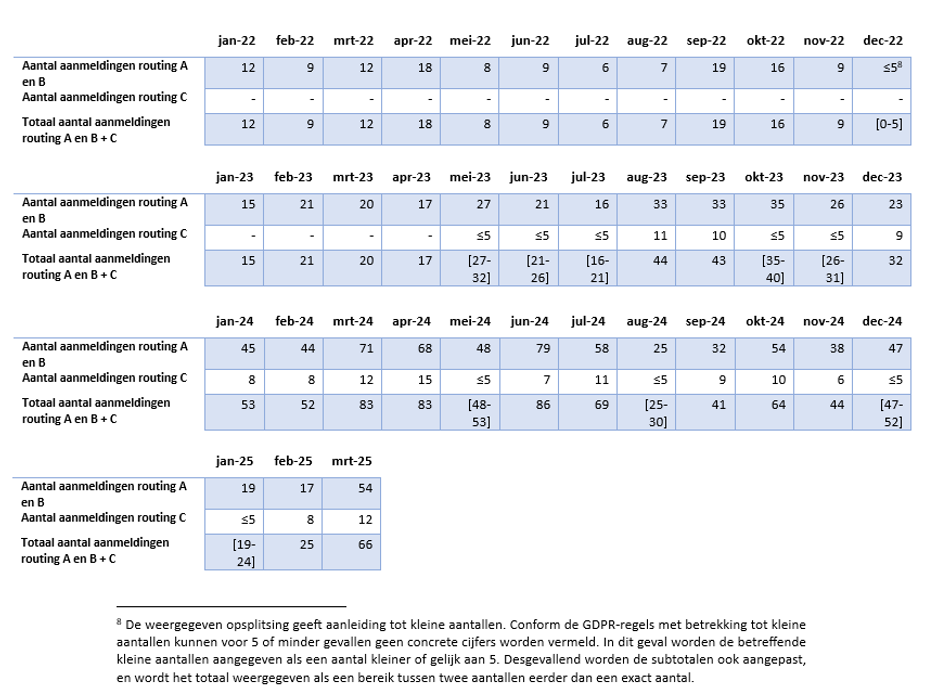 Figuur 30 geeft een overzicht van het totaal aantal aanmeldingen van zowel route A en B als route C. Er is een algemeen stijgende trend op te merken, met een totaal van 5.612 aanmeldingen in 2022, gevolgd door een stijging naar 8.524 aanmeldingen in 2023 en een totaal van 14.290 aanmeldingen in 2024. In het eerste kwartaal van 2025 waren er reeds 4.224 aanmeldingen.