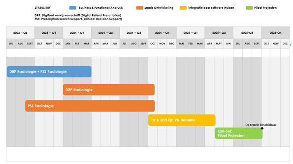 De realisatie van dit project is gestart in 2021 en heeft een voorziene looptijd tot 2026. We werken tot in 2026 samen met verschillende partners aan de ontwikkeling en uitrol van deze voorschrift zoek ondersteuning tool. Een succesvolle uitrol kan enkel verzekerd worden als we met alle betrokken partijen zoals de zorgverleners, verzekeringsinstellingen, patiëntenorganisaties, eHealth maar ook softwareleveranciers samenwerken.