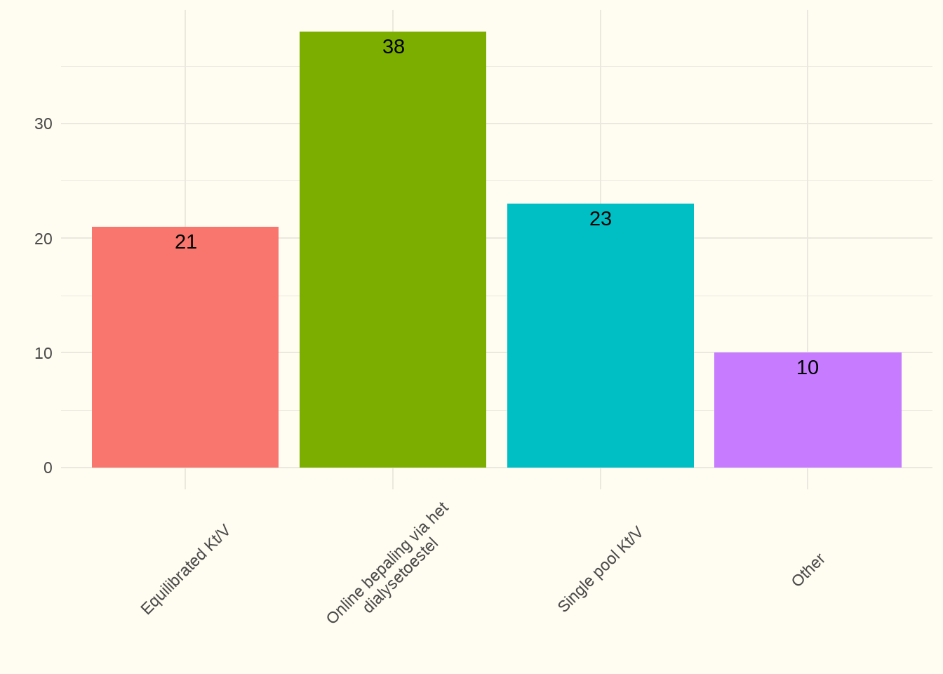Bespreking: De meeste dialysecentra gaven aan dat dit (minstens) gebeurde met een “equilibrated Kt/V” en/ of tijdens elke dialysesessie via het dialysetoestel (“online bepaling”). Eén centrum beantwoordde deze vraag niet.