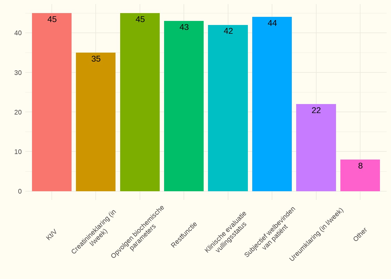 Bespreking: “Kt/V” en “biochemische parameters opvolgen” scoren op deze vraag het hoogst (92%). Noteer ook dat 88% van de respondenten de restfunctie bepalen. Tot slot stelt 90% van de respondenten het welbevinden van de patiënt ook als een parameter mee op te volgen. Twee centra hebben niet op deze vraag geantwoord. Het overgrote deel van de centra (84%) geeft aan dat ze deze opvolging op een systematische wijze meermaals per jaar of jaarlijks doen. Eén centrum beantwoordde deze vraag niet.