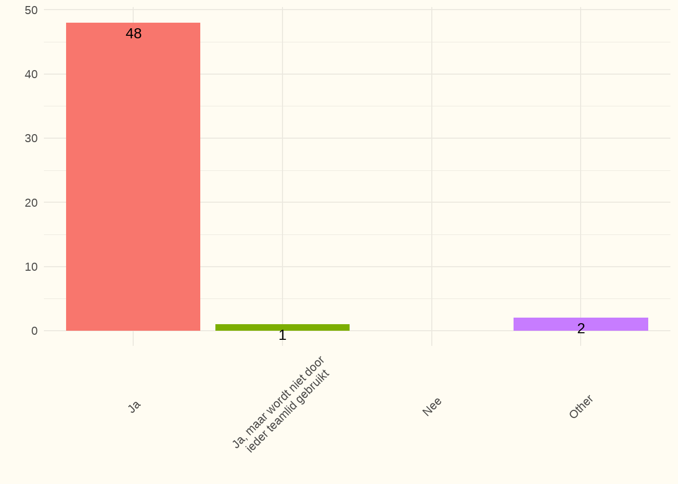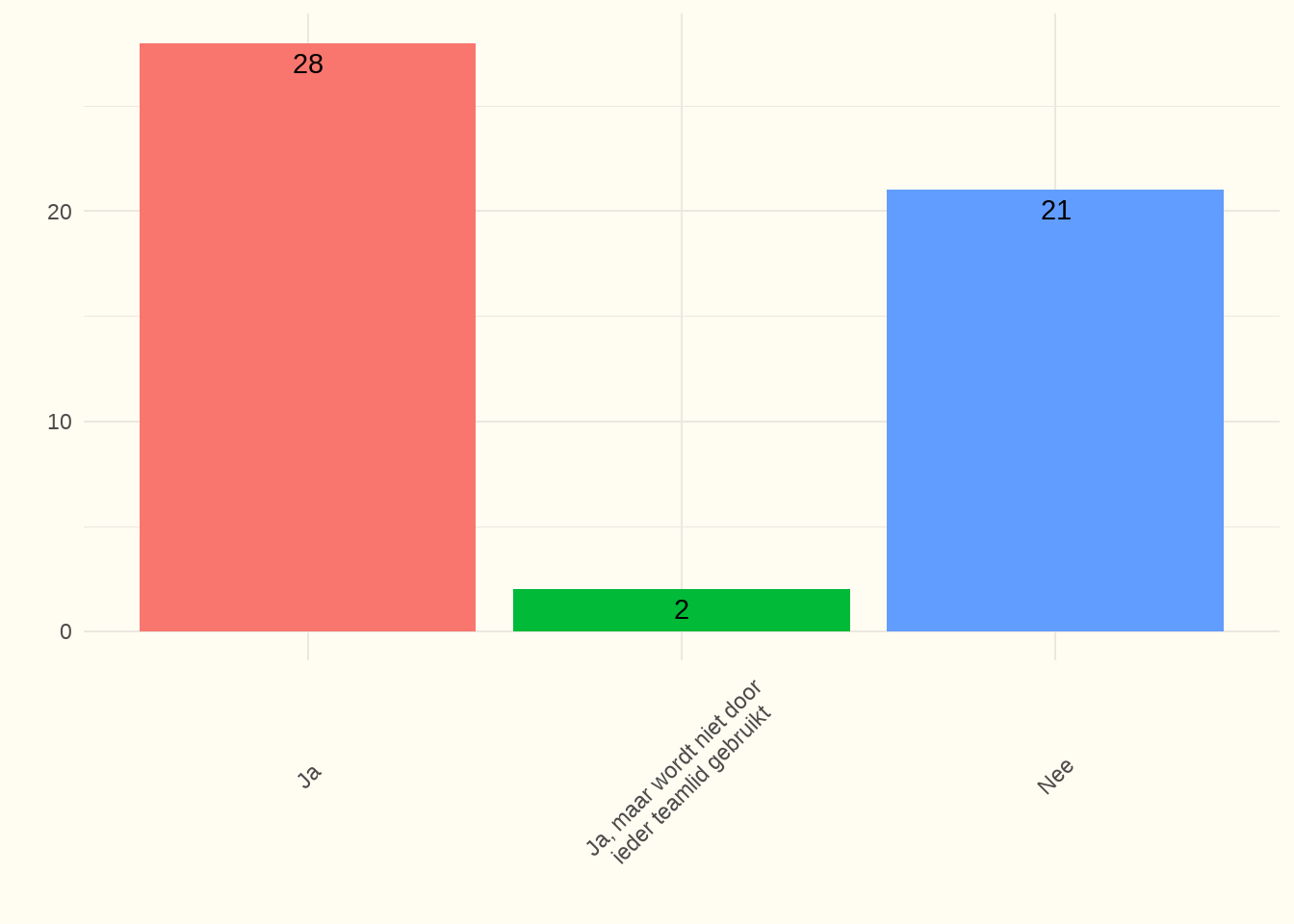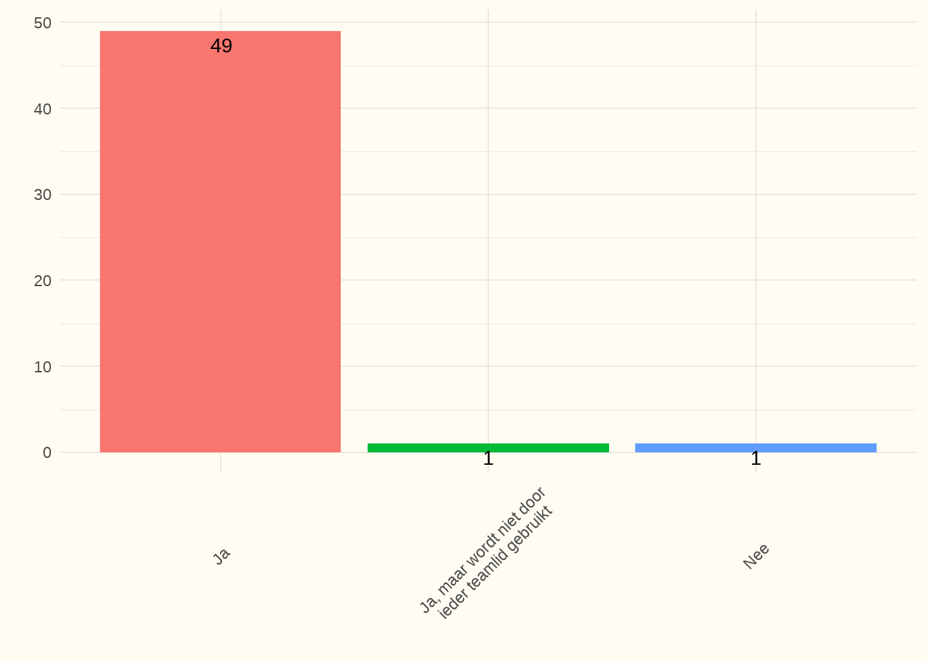 Bespreking: 54% van de centra antwoordden hierover te beschikken en gaven aan dat het ook geïmplementeerd is. Twee centra hadden wel een protocol, doch niet ieder teamlid gebruikte het. Het responspercentage bedroeg 100%.