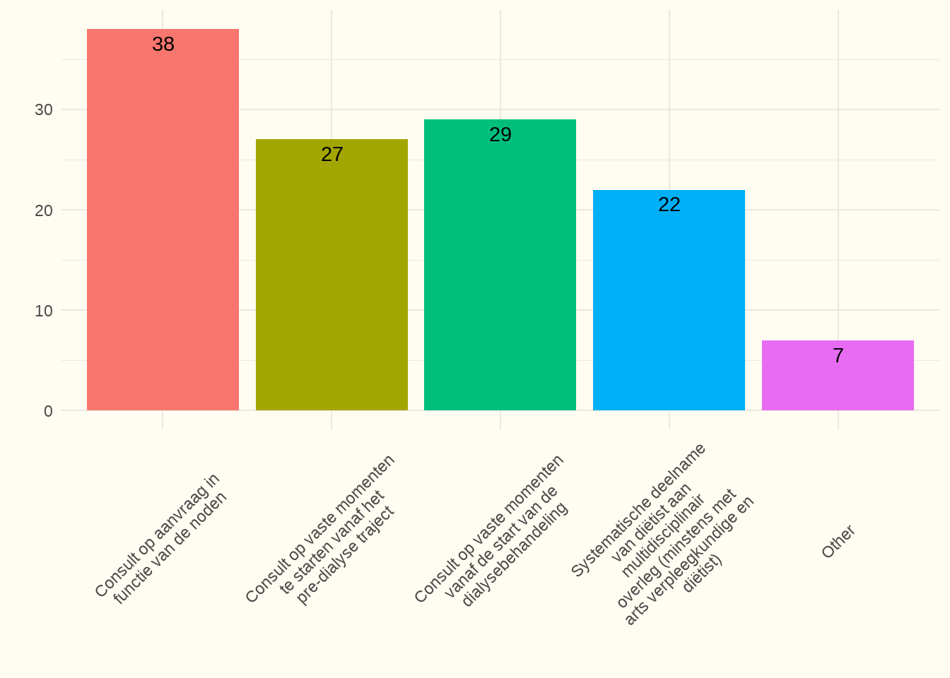 Daarnaast werd gekeken naar wanneer de diëtist betrokken werd. Dit gebeurde in de meeste centra (21/24) in de eerste dagen na opstart van de dialyse, vaak met een maandelijkse opvolging. In de helft van de centra (12/24) werd de diëtist al betrokken vanaf het pre-dialysepad. In enkele centra was er geen structurele betrokkenheid van een diëtist en werd deze eerder uitzonderlijk geconsulteerd (o.w.v. financiële discussies over wie de diëtist dient te vergoeden).